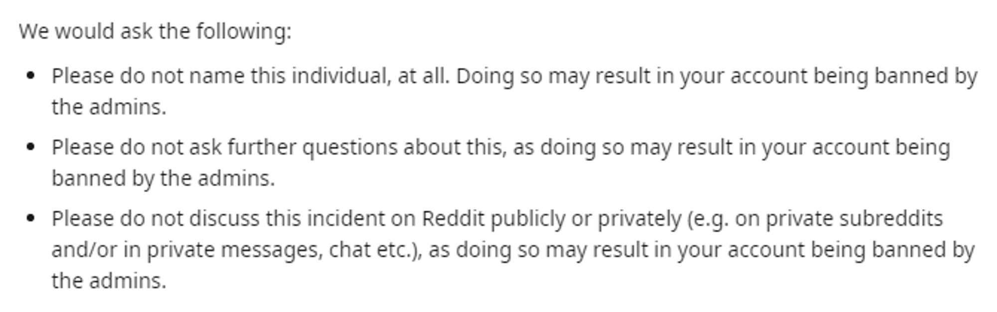 The mystery was soon solved: Redditors claim that the company hired a woman and is suspending anyone who mentions her name or her father's conviction for pedophilia.