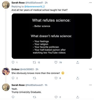 People on Twitter commented on her lack of expertise, asking faceticiously if she has a medical degree or how she could think she knows more than a coroner.