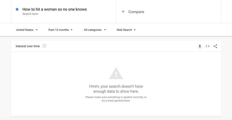 A search for the phrase “how to hit a woman,” however, pulled up results for the past 12 months, with a peak interest of 100 searches at the end of August in 2020. The graph represents search interest relative to the highest point on the chart. A value of 100 is the peak popularity for the term.