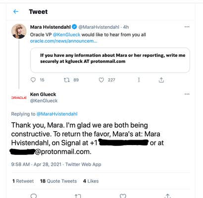 "Actually she includes both her signal and proton mail in her stories about Oracle and if you look at her feed she tweets contacts seeking information so ... it's neither doxing nor inappropriate," he tweeted when someone accused him of doxing Hvistendahl.