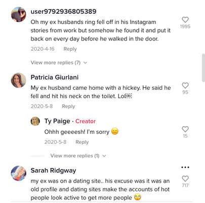 "Oh my ex husband's ring fell off in his Instagram stories from work but somehow he found it and put it back on every day before he walked in the door," one said.