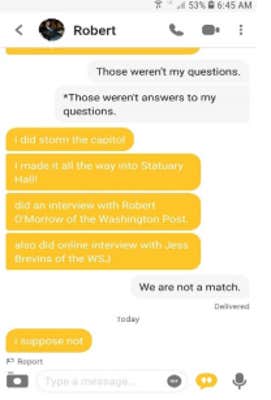 Federal authorities say that after he bragged about participating in the Capitol riots, Robert Chapman's prospective Bumble match rejected him with this message: "We are not a match." Then, they say, his match turned him in.