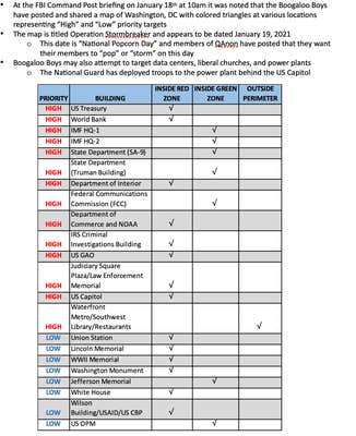 The document notes that the extremist group had shared a map online of Washington, D.C., titled "Operation Stormbreaker," that featured "colored triangles at various locations representing 'High' and 'Low' priority targets."