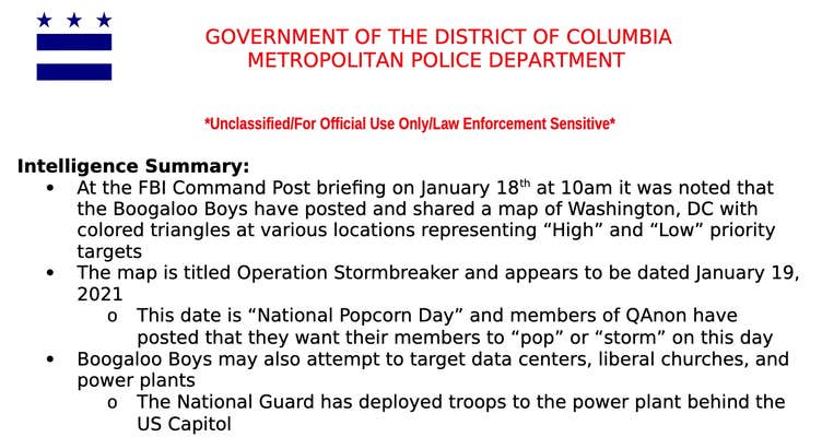The document goes on to warn that "Boogaloo Boys may also attempt to target data centers, liberal churches, and power plants" before noting that the National Guard, who was still in D.C. following the failed insurrection, had been deployed "to the power plant behind the US Capitol."