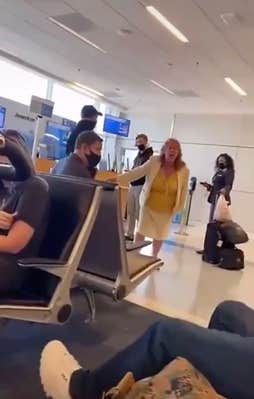 After she enters the seating area, she seemingly seeks validation from passengers, repeatedly screaming, “Who saw him choke me to the ground?”