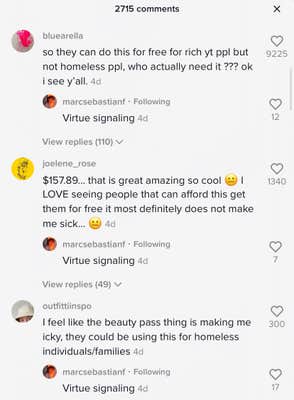 “I feel like the beauty pass thing is making me icky, they could be using this for homeless individuals/families,” one viewer wrote.