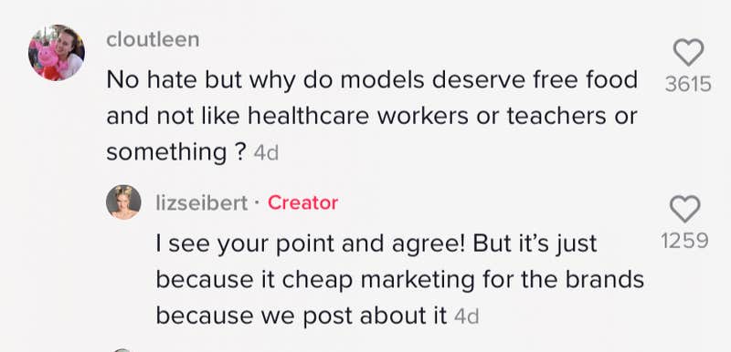 In response to one commenter asking why models deserve free food as opposed to teachers or healthcare workers, Seibert said “I see your point and agree! But it’s just because it’s cheap marketing for the brands because we post about it.”