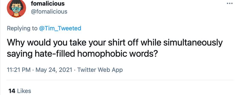 "Why would you take your shirt off while simultaneously saying hate-filled homophobic words?" @fomalicious asked on Twitter.