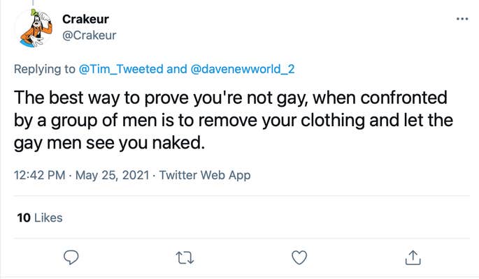 "The best way to prove you're not gay, when confronted by a group of men is to remove your clothing and let the gay men see you naked," @Crackeur wrote.