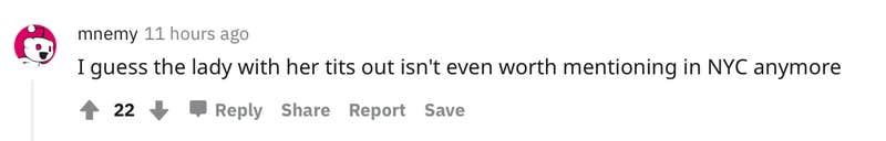 "I guess the lady with her tits out isn't even worth mentioning in NYC anymore," u/mnemy wrote.