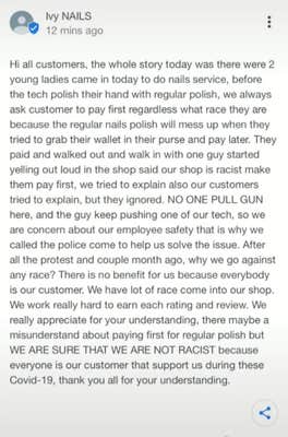 The response contends, "We always ask customer to pay first regardless what race they are because the regular nails polish will mess up when they tried to grab their wallet in their purse and pay later." The nail salon representative also denied the charges about flashing the gun, saying "NO ONE PULL GUN here," and claiming "the guy keep pushing one of our tech," referring to the older brother who acted on the TikToker's behalf.