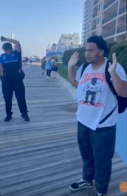 The footage begins with the young man surrounded by numerous Ocean City police officers; however, he puts his hands up.