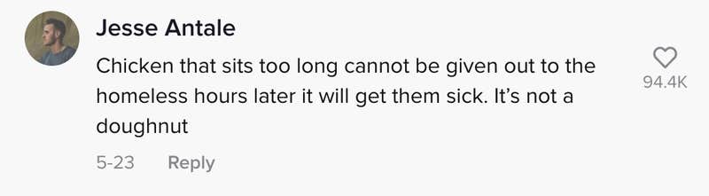 “Chicken that sits too long cannot be given out to the homeless hours later,” one user commented. “It will get them sick.”