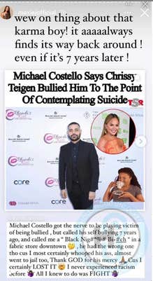 In his post, Costello said he reached out to Teigen to clear up the situation, but she appears to have told him his career was over. The post also included what looks to be screenshots of Costello messaging Teigen via Instagram to try to speak with her.
