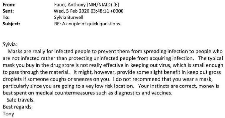 The email was sent in February 2020. Dr. Fauci didn't start recommending masks until that April, a switch for which he's been criticized. Dr. Fauci has said part of the reason he didn't recommend masks in the early days was based on the shortage of equipment hospitals were experiencing at the time, and because the science was still developing regarding the virus and masks' efficacy.