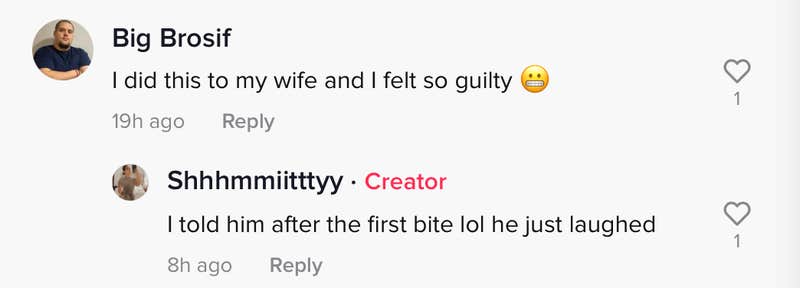 When another commenter said he felt guilty when doing something similar to his wife, the creator of the video said she let her significant other know what she did after the first bite and that he laughed about it.