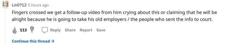 "Fingers crossed we get a follow-up video from him crying about this or claiming that he will be alright because he is going to take his old employers/the people who sent the info to court," u/Lin0712 wrote.