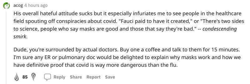 "His overall hateful attitude sucks but it especially infuriates me to see people in the healthcare field spouting off conspiracies about covid," u/acog wrote. "'Fauci paid to have it created,' or 'There's two sides to science, people who say masks are good and those that say they're bad.'