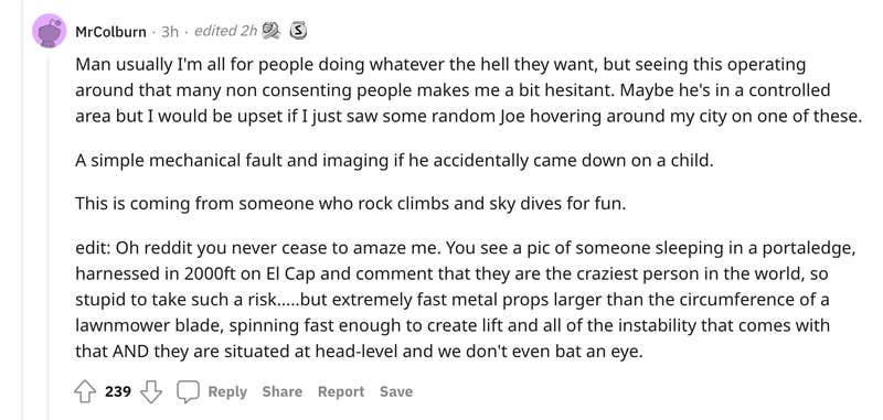 Another person pointed out public safety, “Man usually I'm all for people doing whatever the hell they want, but seeing this operating around that many non consenting people makes me a bit hesitant. Maybe he's in a controlled area but I would be upset if I just saw some random Joe hovering around my city on one of these.”