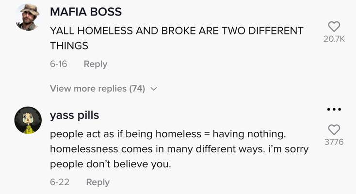 “People act as if being homeless = having nothing,” one user commented. “Homelessness comes in many different ways. I’m sorry people don’t believe you.”