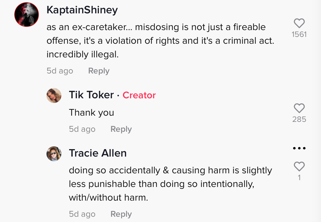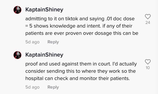 Another user pointed out that there is a difference between accidentally giving an incorrect dose and doing so on purpose, which might result in a less harsh punishment. However, @KaptainShiney pointed out that the comments referenced by the original poster admitted to the deed on TikTok, showing "knowledge and intent."