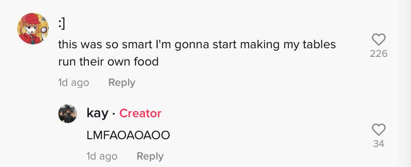 Another commenter, who implied they are a server, jokingly said they were taking notes. "This was so smart I'm gonna start making my tables run their own food," @gaslightitty wrote.