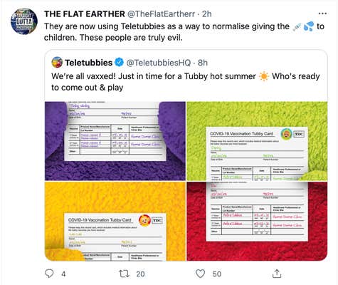 A flat earther Twitter user said, “They are now using Teletubbies as a way to normalise giving the [COVID-19 vaccine] to children. These people are truly evil.”