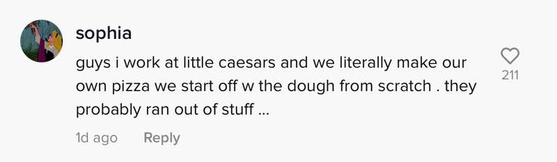 "Guys I work at Little Caesars and we literally make our own pizza we start off with the dough from scratch," A user named Sophia wrote. "They probably ran out of stuff."