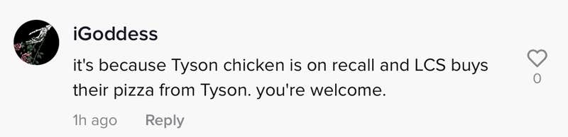 This user offered an alternative to the hypothesis that an ingredient shortage caused the strange situation shown in the video. They claim that Tyson's recent recall has impacted Little Caesars because they buy their pizzas from the meat processor.