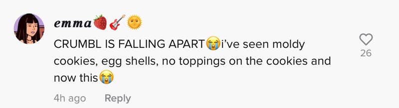 Another commenter alleged they've seen other questionable things from Crumbl Cookies on the platform. "CRUMBL IS FALLING APART," @emma__.sophie wrote. "I've seen moldy cookies, egg shells, no toppings on the cookies and now this."