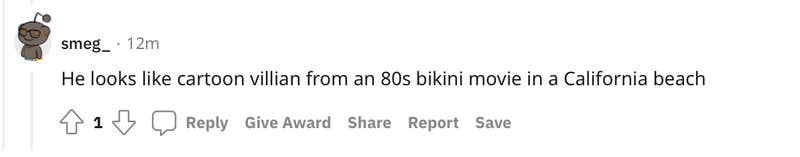 "He looks like cartoon villain from an '80s bikini movie in a California beach," u/smeg_ wrote.