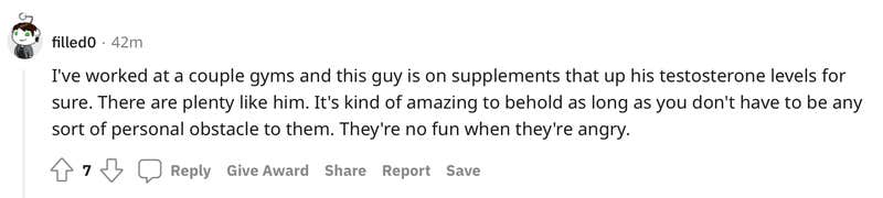 "I've worked at a couple gyms and this guy is on supplements that up his testosterone levels for sure," u/filled0 wrote. "It's kind of amazing to behold as long as you don't have to be any sort of personal obstacle to them."