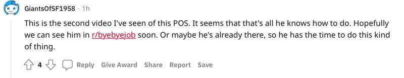 "This is the second video I've seen of this POS," the user wrote. "It seems that that's all he knows how to do. Hopefully we can see him in r/byebyejob soon."