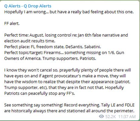 "Hopefully I am wrong... but [I] have a really bad feeling about this one," Q Alerts - Q Drop Alerts wrote to their 55,000 Telegram subscribers on Tuesday. They claim that an upcoming Gun Owners of America demonstration supporting Floridians carrying concealed weapons without a permit might be targeted by a shadowy group of "agent provocateurs" for a false flag operation.