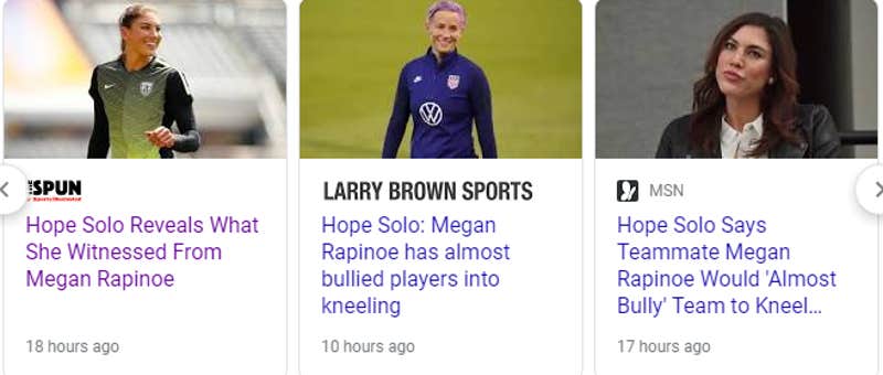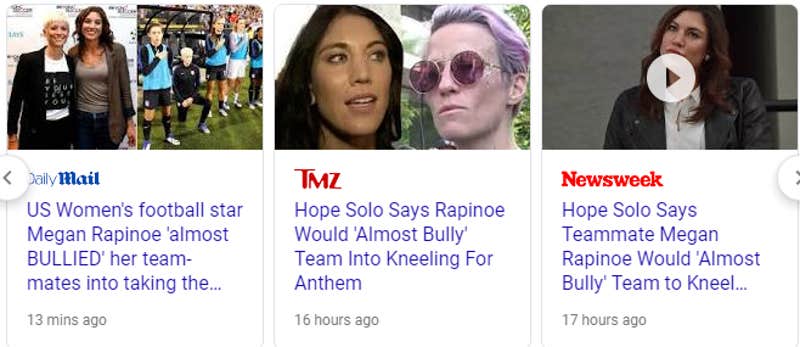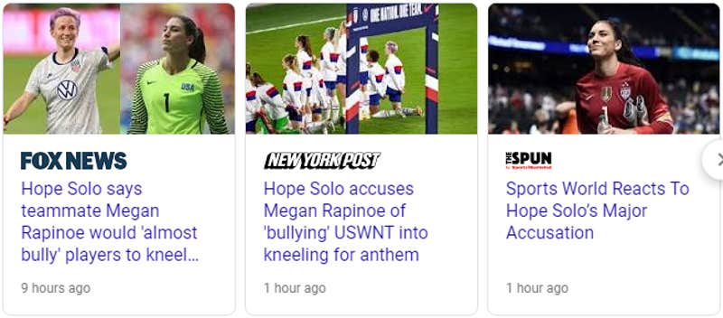 As her claim gained steam, many pointed out that Solo was off the team before Rapinoe dropped to a knee during the anthem on Sept. 4, 2016. Rapinoe was the only member of the team to do so at the time.