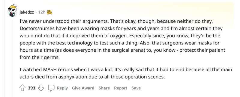 "Doctors/nurses have been wearing masks for years and years and I'm almost certain they would not do that if it deprived them of oxygen," u/jakedzz wrote. "Especially since, you know, they'd be the people with the best technology to test such a thing. Also, that surgeons wear masks for hours at a time (as does everyone in the surgical arena) to, you know - protect their patient from their germs."