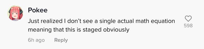 "Just realized I don't see a single actual math equation meaning that this is staged obviously," @pokee_yt wrote.