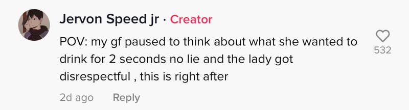 It's not clear what was said previous to the start of the video, but it begins with TikToker @lotp_von saying, "(You're) mad because you hate your job," before proceeding to order an item off the menu. "Anyways, can I get aa number 10?"
