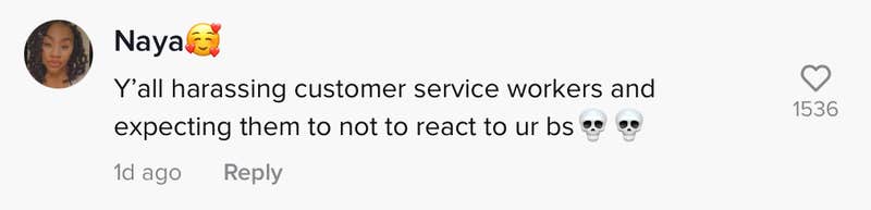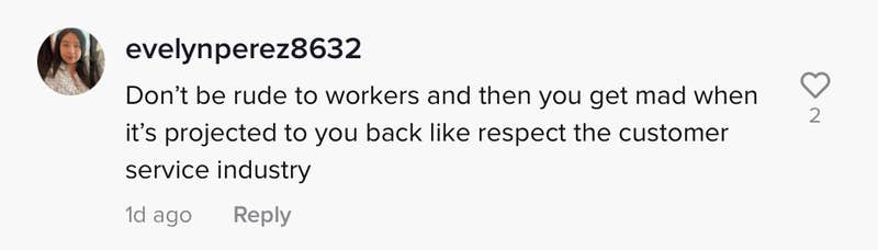 One commenter pointed out that one shouldn't be rude to workers and then expect no reaction. "Don't be rude to workers and then you get mad when it's projected to you back like respect the customer service industry," they wrote.