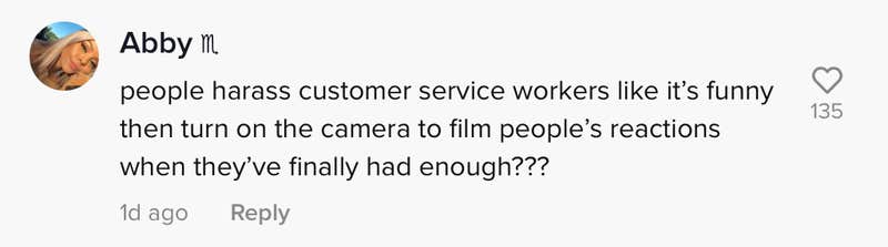 Another commenter pointed out the unfair nature of only filming part of the interaction. "People harass customer service workers like it's funny then turn on the camera to film people's reactions when they've finally had enough," @abigailkaitlin wrote.