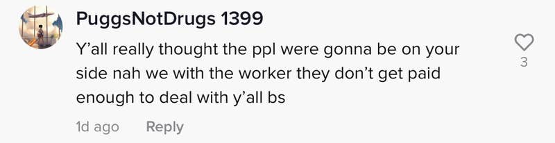 "Y'all really thought the ppl were gonna be on your side nah we with the worker they don't get paid enough to deal with y'all bs," @puggsnotdrugs wrote.