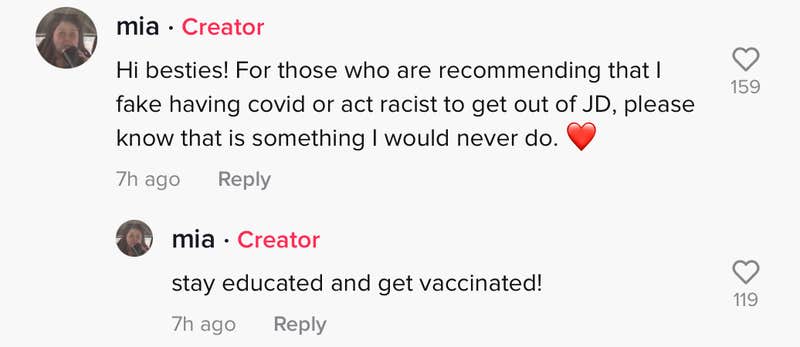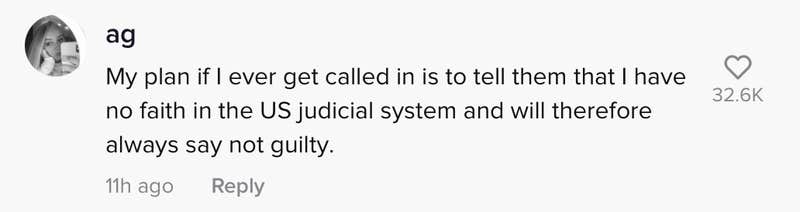 @miagravess wrote in the comments section of her video that some suggested other means of getting out of jury duty, such as pretending she had COVID or that she was racist—something she said she would never do.