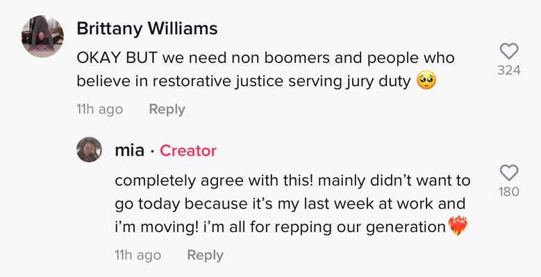 When another user commented that they actually wished more young people who believe in restorative justice would serve on a jury, @miagravess said she completely agreed and that she wanted to get out of jury duty because she was moving and it was her last week at work.