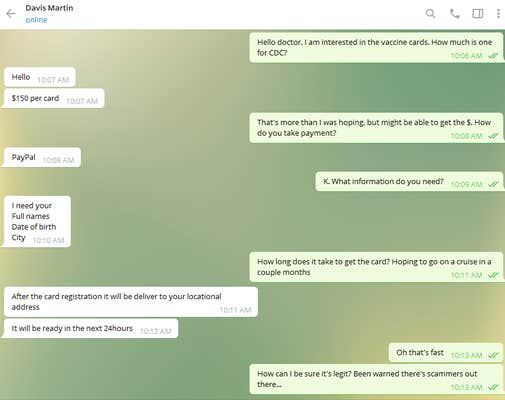 Whoever runs the account told a Daily Dot reporter posing as an interested buyer that a CDC vaccine card would cost $150. They instructed a reporter to send payment via PayPal.