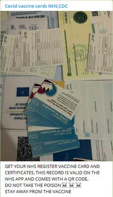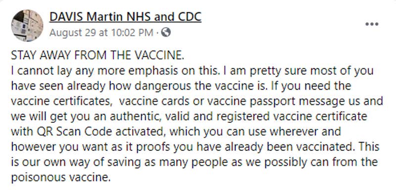 The group, DAVIS Martin NHS and CDC, urges people, "Get your Covid19 vaccination card without being vaccinated so as to avoid the vaccination scheme." It claims that the cards are "authentic, valid and registered" with the Centers for Disease Control and Prevention (CDC) and agencies in other countries.