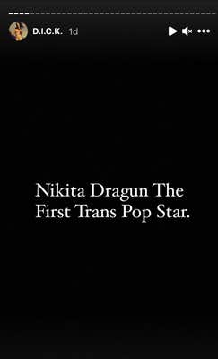 “THE COMPLETE AUDACITY OF NIKITA DRAGUN CALLING HERSELF “THE FIRST TRANS POPSTAR,” wrote one user on Twitter.