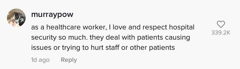 "As a healthcare worker, I love and respect hospital security so much," one commenter wrote. "They deal with patients causing issues or trying to hurt staff or other patients."