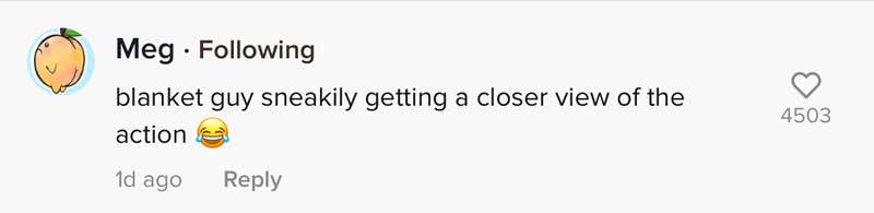 However, there was a second star of the show. Halfway through the video, a man sits down right near the action in a blue-trimmed blanket, drawing comparisons to Mother Teresa, who was known for wearing robes that were similarly decorated.