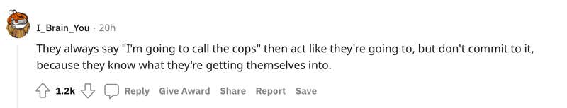 "They always say, 'I'm going to call the cops,' then act like they're going to, but don't commit to it, because they know what they're getting themselves into," u/I_Brain_You wrote.