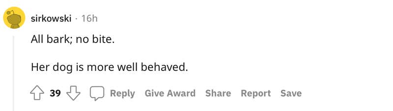 Another commenter joked her dog had been better behaved than the screaming woman, noting: "All bark; no bite. Her dog is more well behaved."